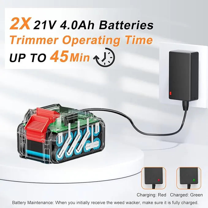 Features a more powerful motor and AAAAA-grade battery for better performance and longer use.Includes 2× 21V 4000mAh lithium batteries; 2–3 hour charge time; 60–90 minutes runtime; built-in overload and heat protection.3 Blade Types – Plastic blade for soft grass. Stainless steel blade for grass, weeds & shrubs. Circular saw blade for thick branches and tougher jobs. 35–47 inches; 90° rotatable head converts tool into edger for tricky angles and crevices. Weighs just 3.9 lbs; safety lock button, anti-splash baffle, and auto-stop motor for user protection.