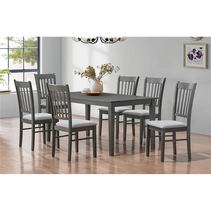 Elevate your dining space with this 7PCS Modern Rubber Wood Dining Set, designed for style, comfort, and durability. Featuring a sturdy rubber wood frame and wood veneer tabletop, it brings natural warmth and modern flair to any home. The chairs come with soft, fabric-upholstered cushion seats and ergonomic backrests for added comfort during every meal. With its contemporary finish and clean lines, this set is perfect for family dinners, casual brunches, or hosting friends.