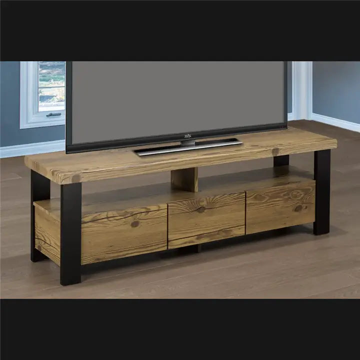 The distressed wood finish of this TV stand, and the two-tone contrast with the deep espresso finish legs will makes a rich, warm addition to any living room. The open back shelf allows for easy wire management, while the three deep set drawers offers great storage opportunity. Product Dimension: 60?W 16?D 20?H.